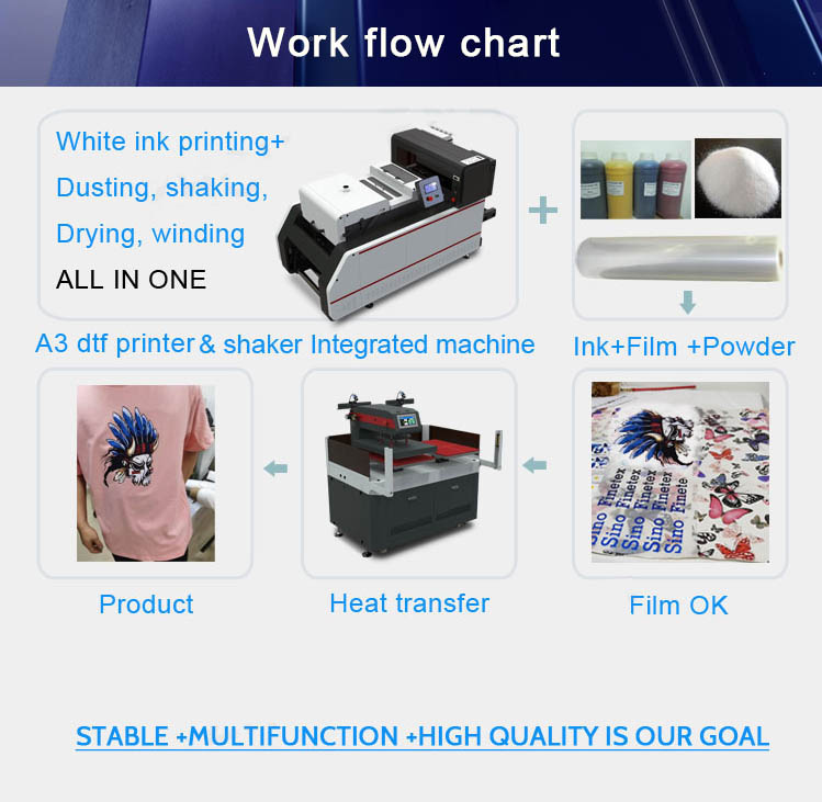 Feature: DTF-A3-i3200 all-in-one DTF printer integrates DTF printing and TPU powder processing, creating a new digital DTF film printing process.
